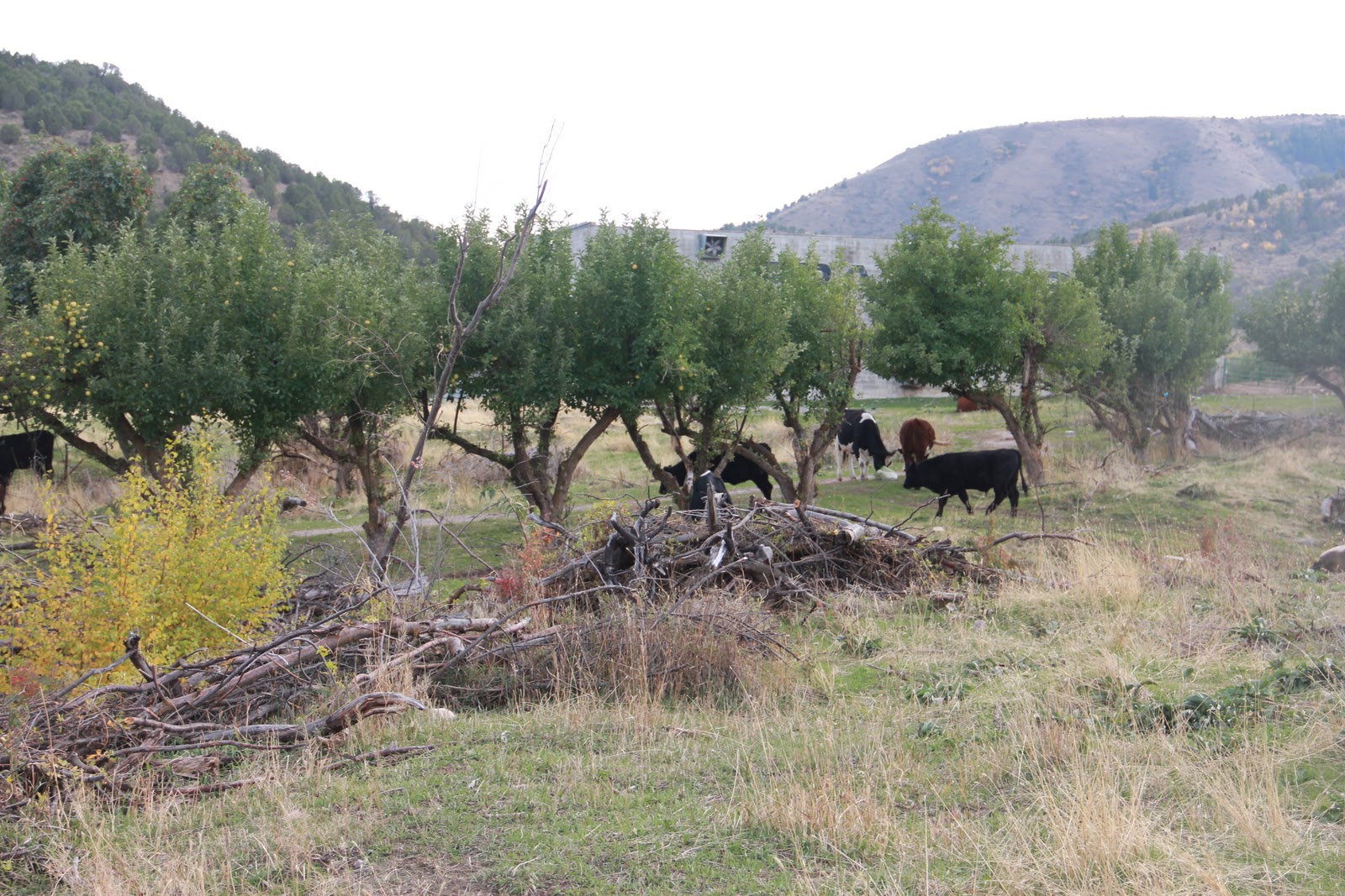 We were just picking and enjoying the orchard to ourselves when all of a sudden these 10 cows and bulls came trotting down the hill and straight towards us. At first I thought it was fun to show Mia the cows so close up, but when I realized they were coming right at us, I got a little nervous. We quickly circled behind them and sadly, our best bag of golden apples was left on the ground and the cows went right for it and started eating our hard-earned apples!